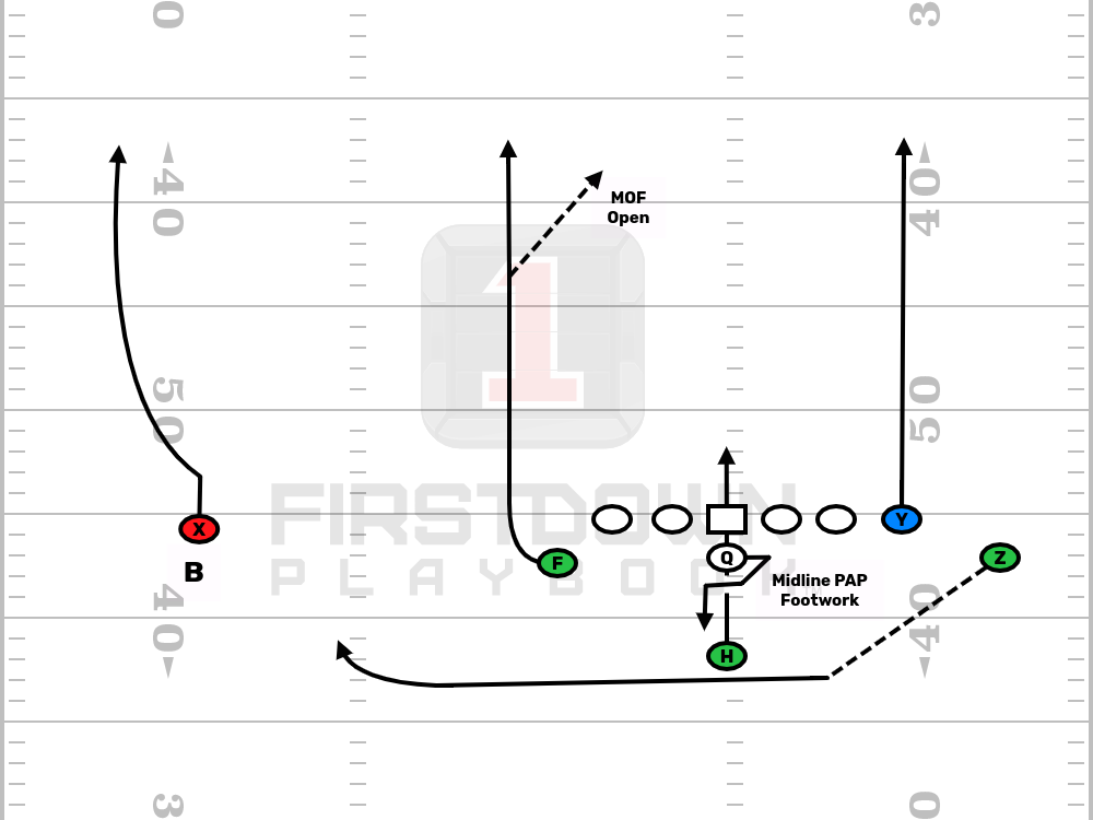 -QB AND FULLBACK WILL FAKE THE MIDLINE OPTION TO THE WEAK SIDE.