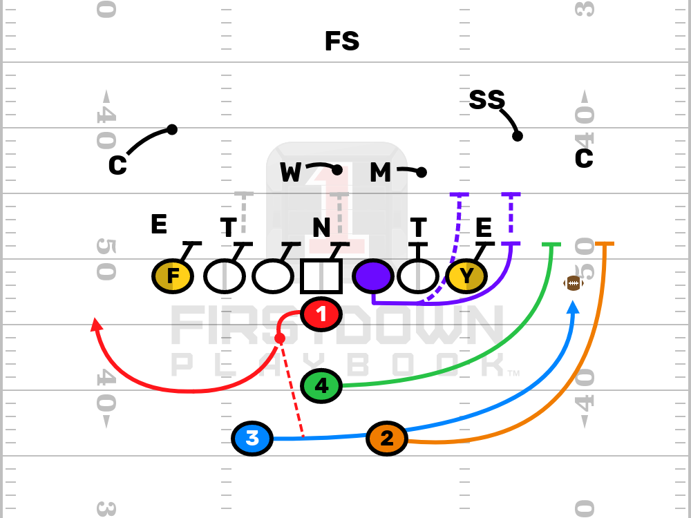 TOSS SWEEP WITH MAN BLOCKING PRINCIPLES PLAYSIDE AND A ZONE CUTOFF SCHEME ON THE BACKSIDE.